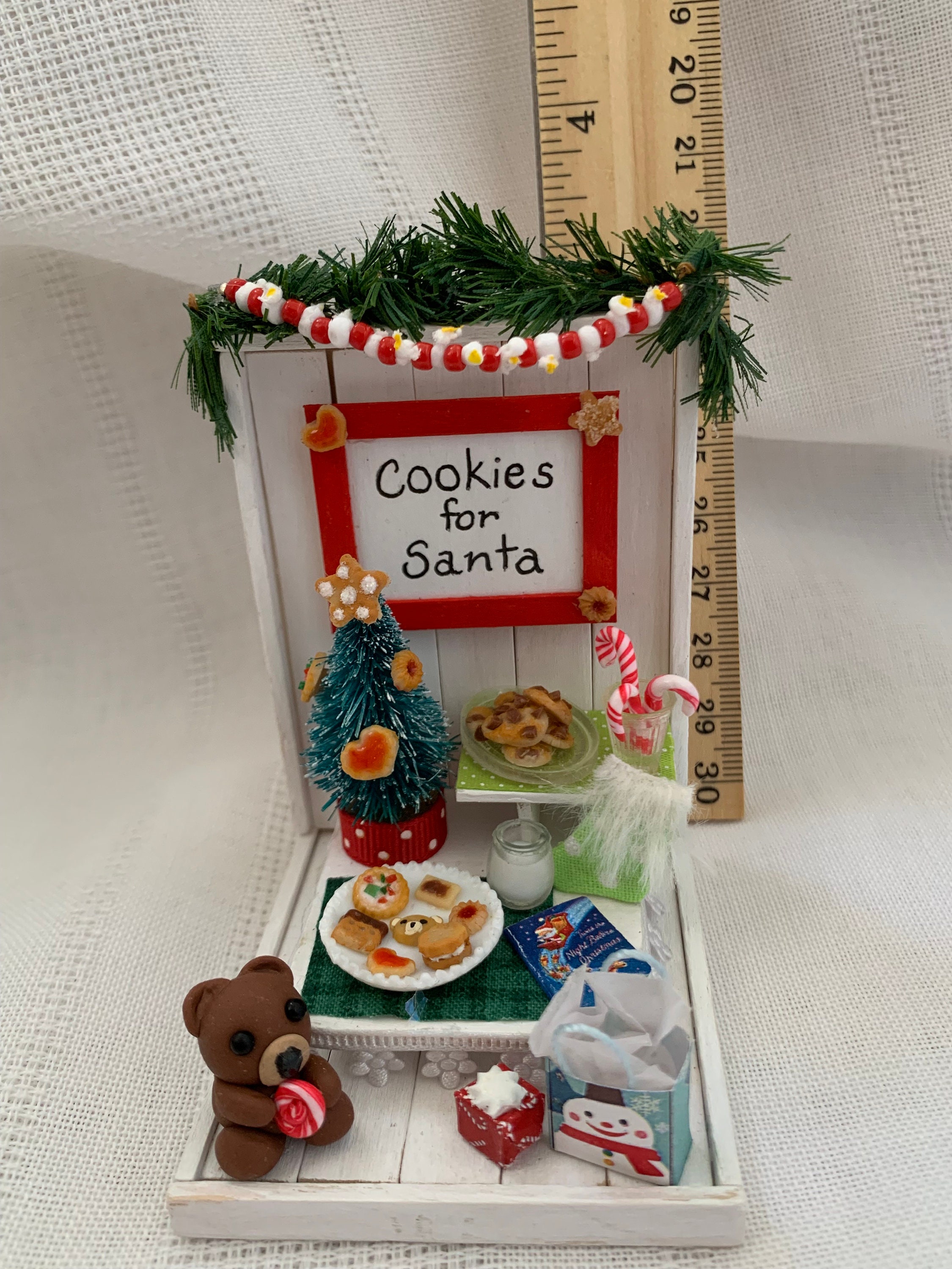 Miniature diorama - Cookies for Santa measures 3 1/2" high by 2 1/8" wide and 2 1/2" deep.